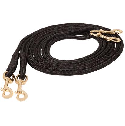 Draw Rein Mustang to czarna wodza wykonana z wysokiej jakości nylonowej liny. Mosiężne zatrzaski z dużym oczkiem umożliwiają swobodne przesuwanie wodzy.
