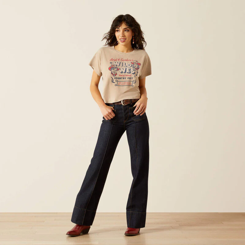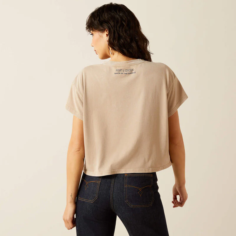 Koszulka damska Ariat Sendero Wild West Country- Wracamy do gry z naszymi przyjaciółmi z Sendero. Zaprojektowana we współpracy. Ten limitowany, skrócony T-shirt z oryginalnym retro wzorem, z którego słynie teksańska marka. Wygodny w noszeniu, lekko skrócona długość. Grafika sitodrukowa