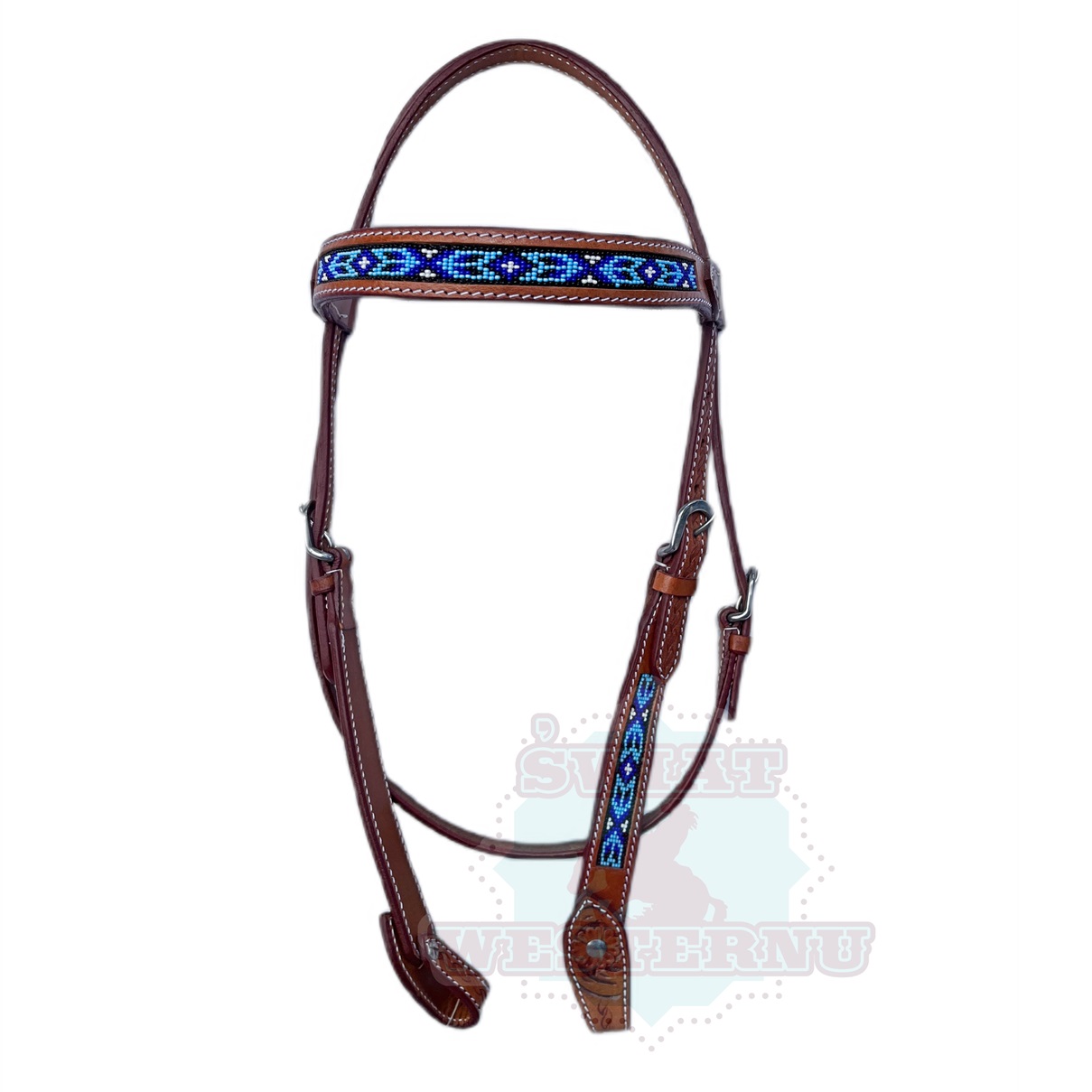 Ogłowie western Blue Sky Wild O West wykonane zostało ze skóry w USA, możliwość dużej regulacji z obu stron. Posiada akcenty z koralików na naczółku oraz paskach policzkowych.