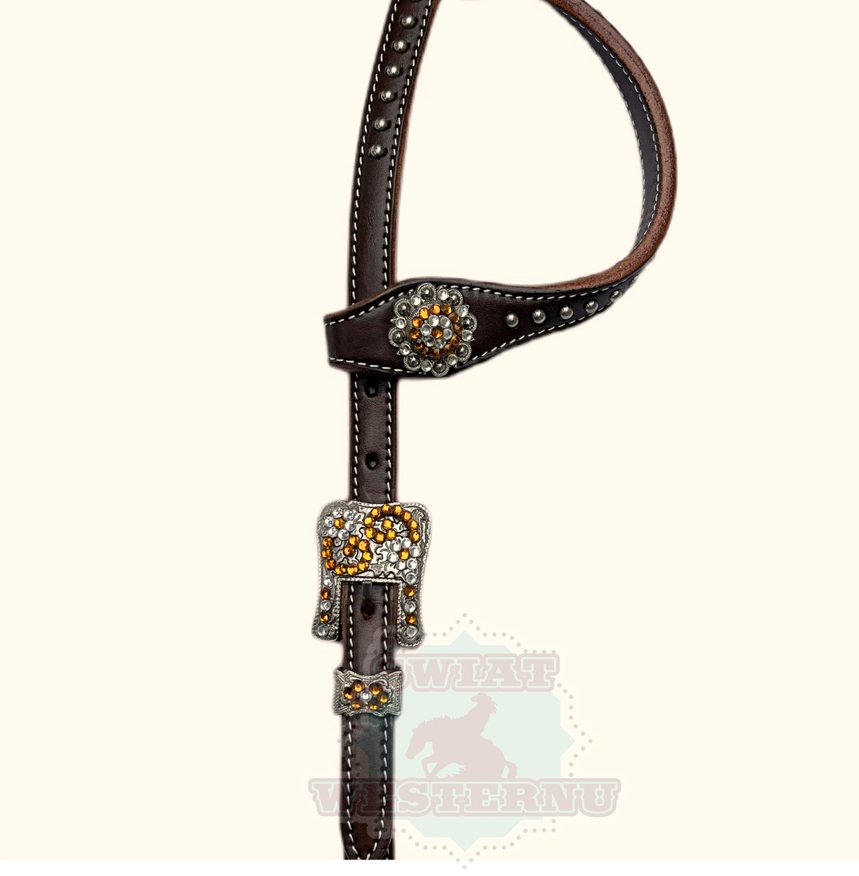 Ogłowie westernowe Show Orange wykonane z najwyższej jakości skóry. Zdobienia na paskach policzkowych oraz potylicy, ozdobne concha oraz sprzączki w kolorze pomarańczowym dają niezwykły efekt kontrastując ze skórą w kolorze czekoladowym. Zdobądź show z tym ogłowiem!
