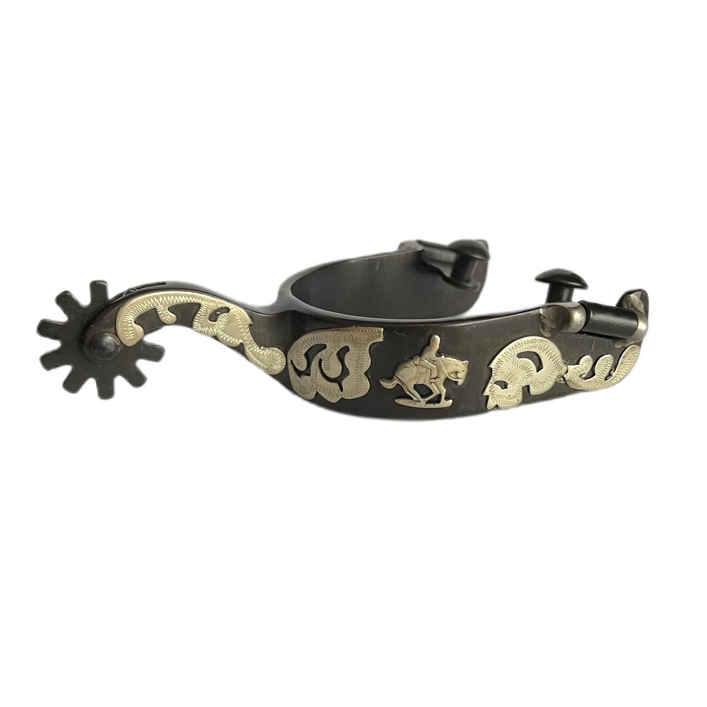 Ostrogi western Sliding Stop Flower wykonane ze stali z motywem kowboja podczas manewru sliding stop.