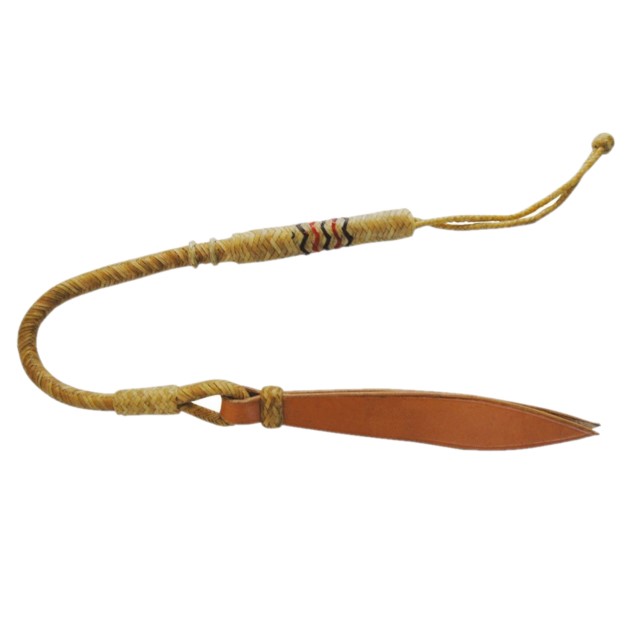 Barrel Racing Whip Rawhide wykonany z plecionej surowej skóry ze skórzaną końcówką. Całkowita długość wraz z mocowaniem oraz skórzaną końcówką to 90 cm.