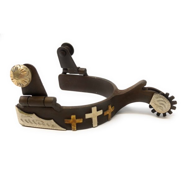 Ostrogi Western Antyczne o wykończeniu antycznym, wyposażone w małą 12- ramienną gwizdkę, odzobione srebrnymi wstawkami oraz motywem w krzyże.